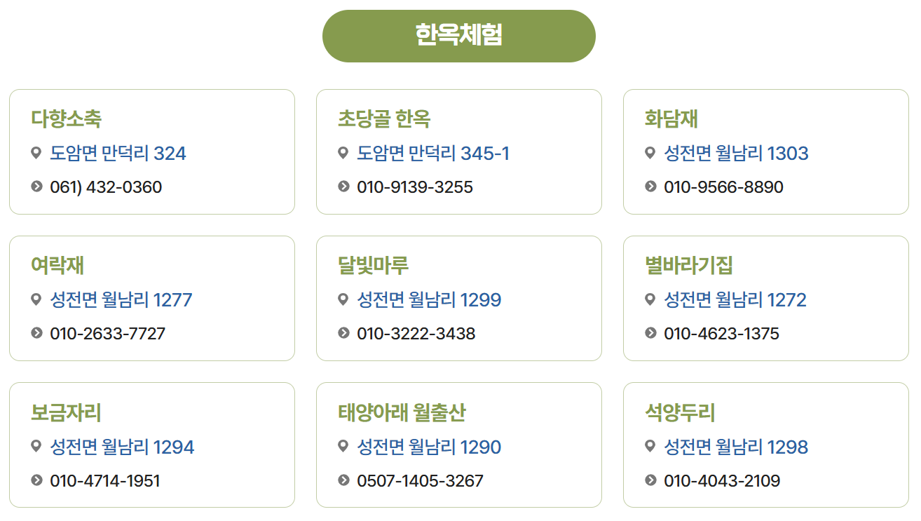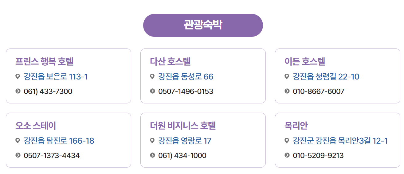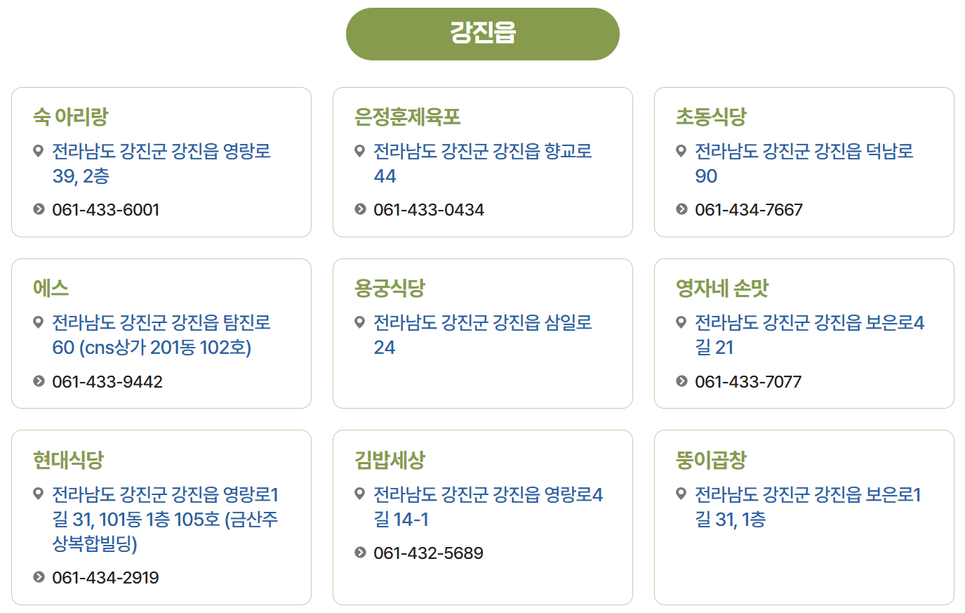 - 목리안: 강진군 강진읍 목리안3길 12-1 (010-5209-9213).