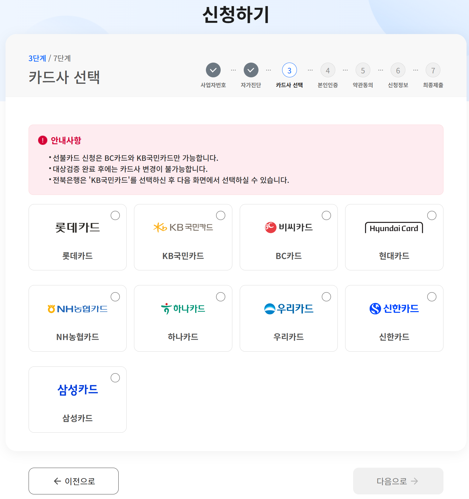 - 카드사 선택: 바우처를 등록하여 사용할 카드사 1곳을 선택 (등록 후 변경 불가)