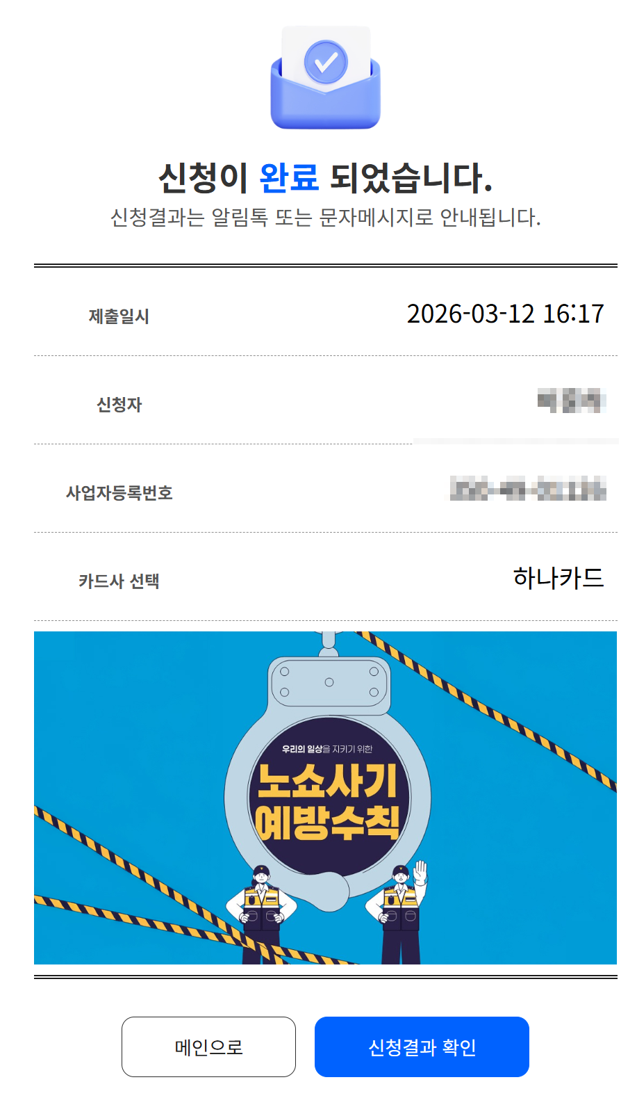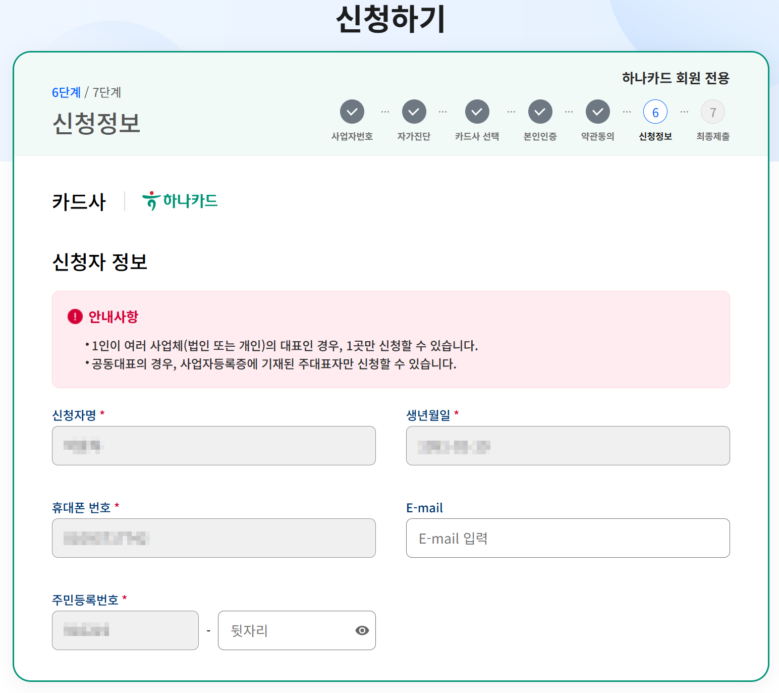 - 정보 입력 및 신청: 업체명, 대표자 성명, 개업일 등 신청 정보를 확인하고 입력