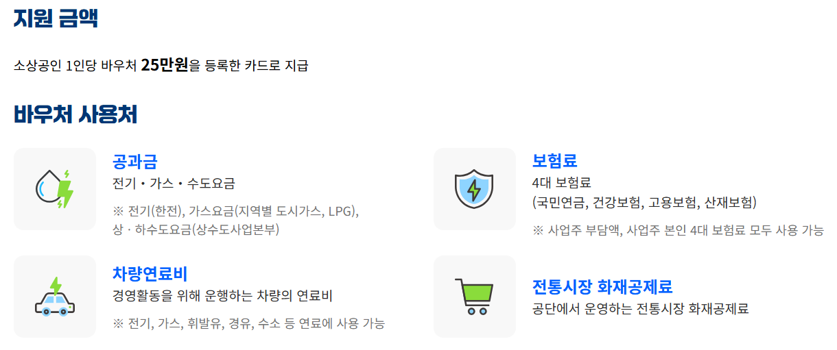 영세 소상공인에게 공과금, 4대 보험료, 차량 연료비 등 경영에 필수적인 고정비용으로 사용할 수 있는 바우처를 지원하는 사업입니다.